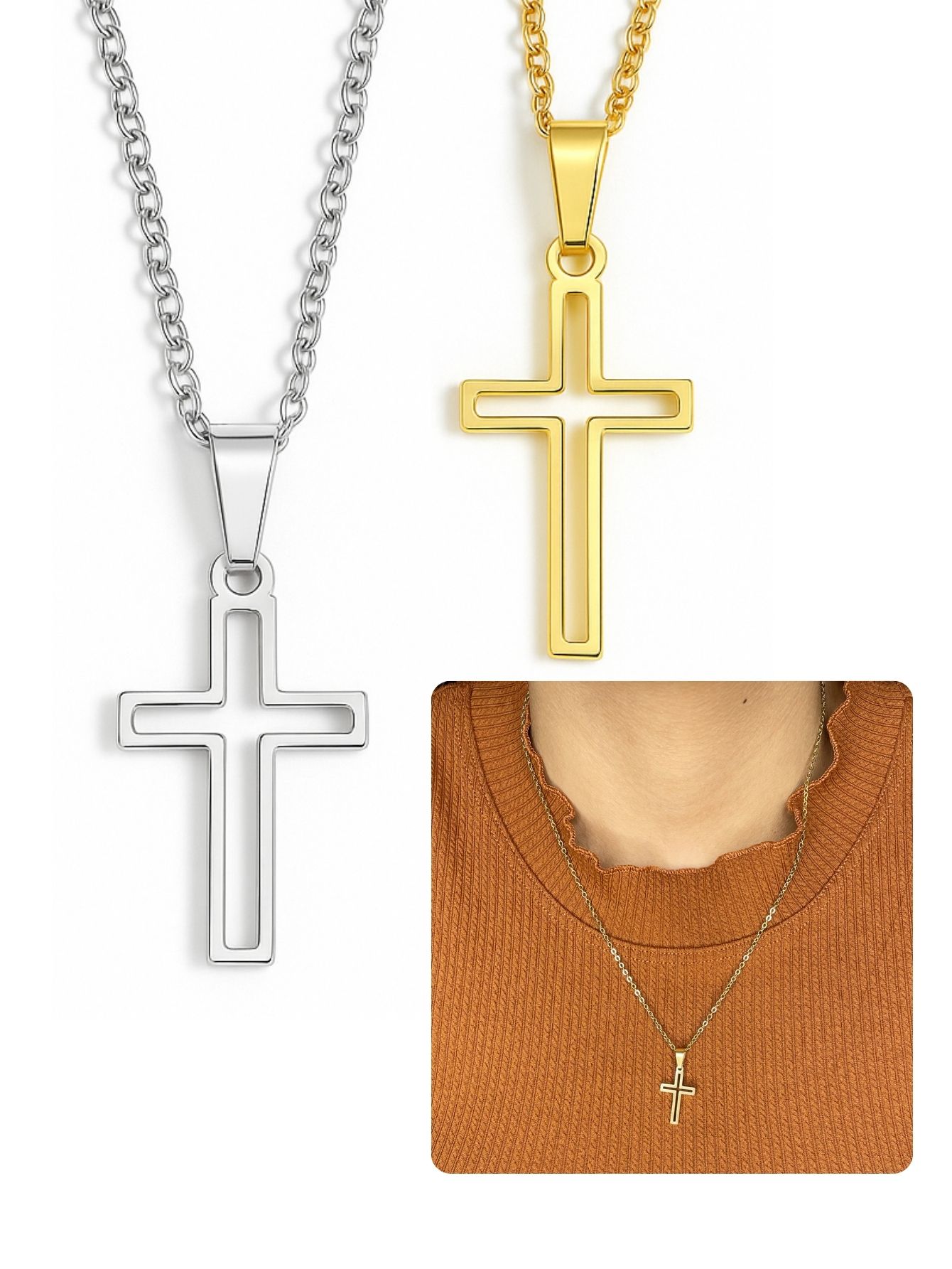 Colar Cordão Feminino Masculino Pingente Cruz Vazada Prata Dourado Aço Inox A Prova D'Água
