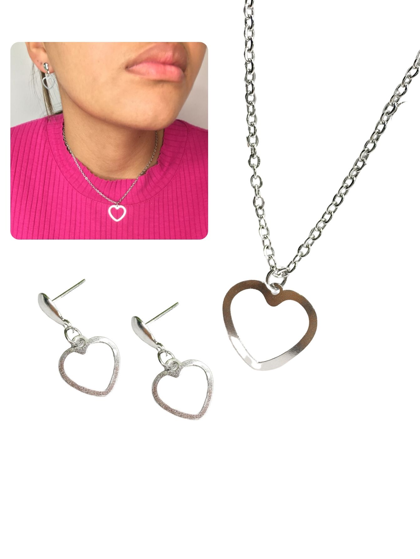 Conjunto Colar e Brinco Feminino 45cm Coracão Vazado Borda Grossa Prata Minimalista Básico Aço Inox