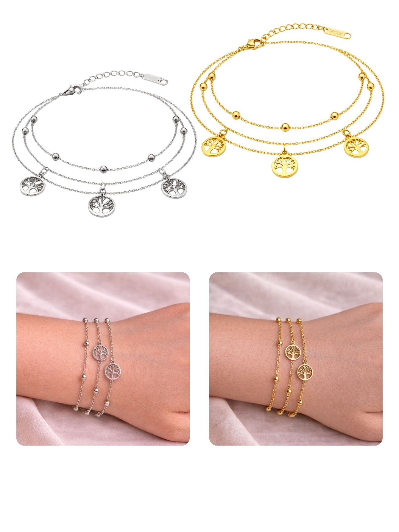 Pulseira 3 em 1 Árvore da Vida Bolinhas Prata Dourado Aço Inox Feminina Elegante Não Escurece
