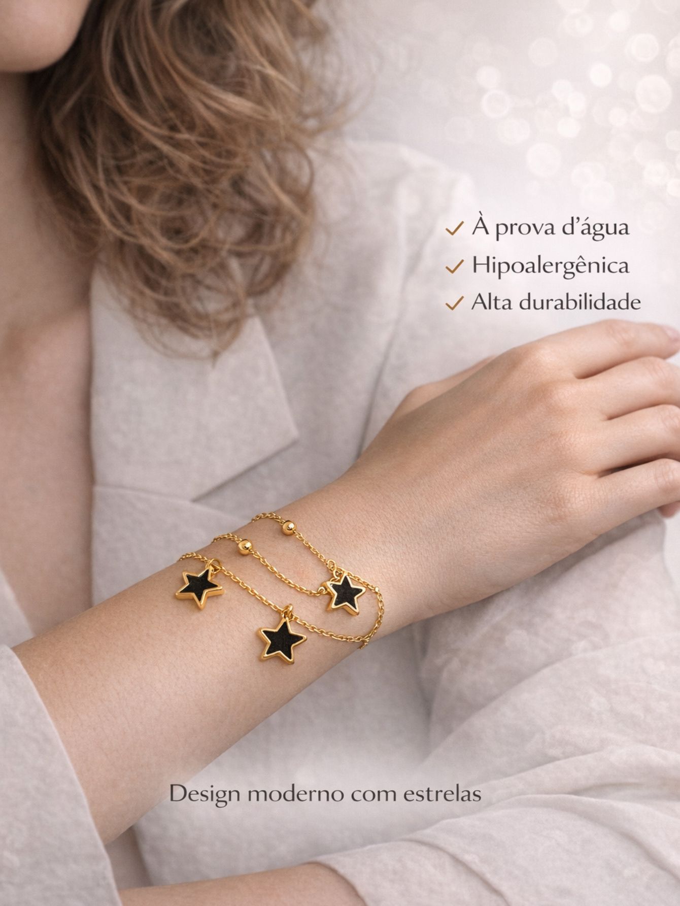 Pulseira Dupla Bolinhas Estrela Madrepérola Branca Preto Aço Inox Prata Dourado Feminina 2 em 1
